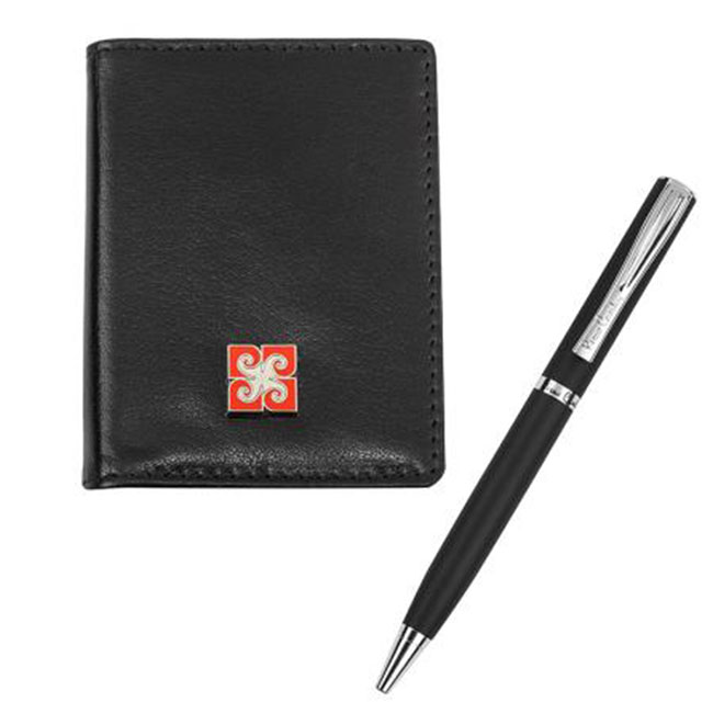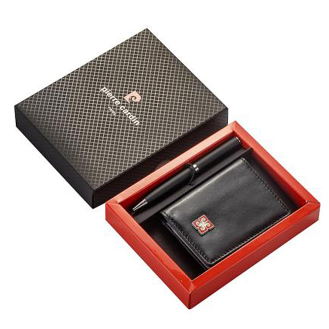 - Луксозен комплект, който съдържа калъф за документи и елегантен химикал, съчетани със стилна кутия Pierre Cardin.