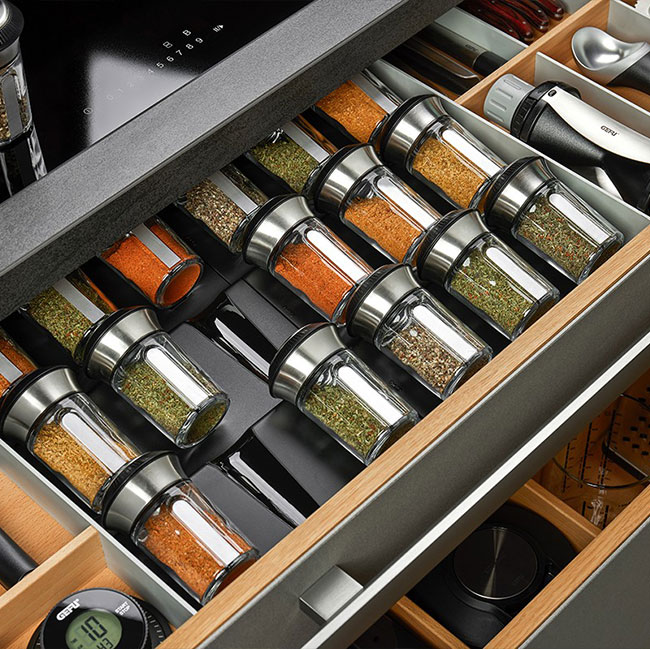Тази практична поставка за съхранение осигурява ред в кухнята и е идеалното място за съхранение на всички бурканчета за подправки и билки от наградената серия X-PLOSION®. Събира се във всяко чекмедже, може да се допълни с допълнителни рафтове и любимите Ви подправки са винаги под ръка.