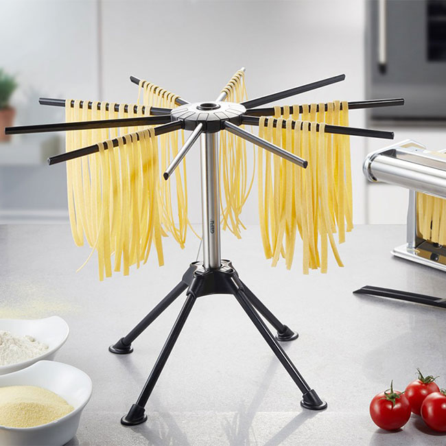 Сушилнята за паста е перфектна за сушене на прясно приготвена пастал. Когато не се използва, може просто да се сгъне и прибере в кухненския шкаф, за да се спести място.
