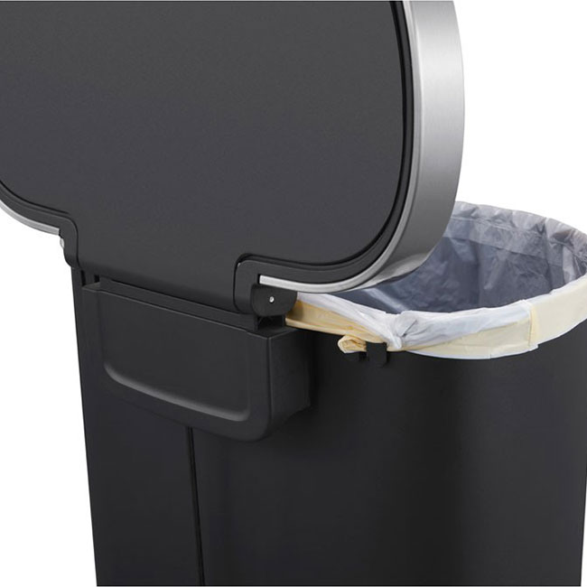 Функционален полукръгъл пластмасов кош с педал и плавно затварящ се капак. Кошът за отпадъци не съдържа вътрешна кофа, което го прави изключително просторен. Широкият фиксатор за торбата за отпадъци я държи на място и я скрива от погледа. Капакът може да се отвори напълно за лесно почистване на кофата или смяна на торбата за отпадъци. Кошът е снабден с вградени колелца отзад, което го прави лесен за преместване.