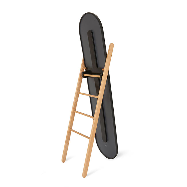 Hub Floor Mirror е тоалетно огледало с дължина до пода, което служи и като органайзер за съхранение на дрехи, кърпи, спално бельо и различни аксесоари. Изработен от масивно буково дърво в естествен цвят с огледало в черна гумена рамка, Hub е функционален за различни пространства, благодарение на компактния си размер и елегантния си дизайн.
