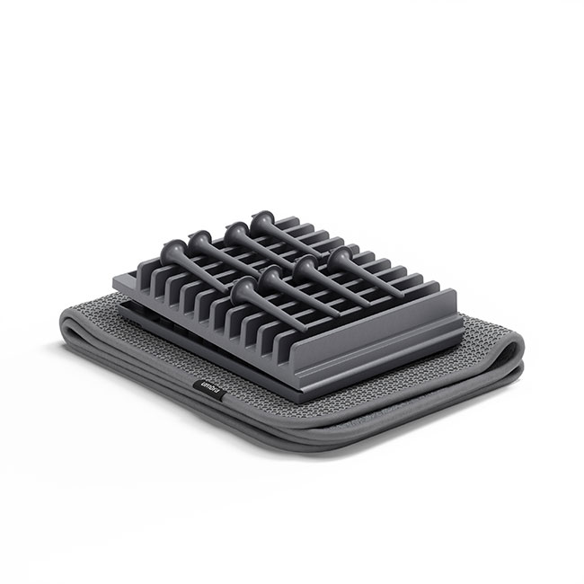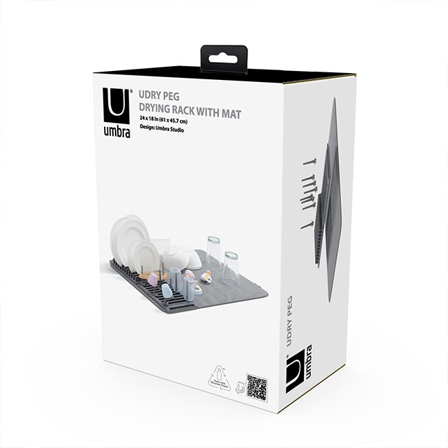 Нашата популярна стойка за сушене UDry с подложка вече се предлага със система с колчета. UDry Peg се предлага с 8 колчета и позволява максимална ефективност на организиране на сушилника при сушене на съдове с неудобна форма. Супер абсорбиращата микрофибърна подложка и включената поставка за съдове с колчета помагат за бързото изсушаване на съдовете ви. UDry е оптимален, когато се използва, а когато не е необходим, компактно се сгъва, за да се съхранява в шкафове и оставя плота ви без претрупване. Спестяващото място решение за сушене осигурява съхранение и организация, като същевременно действа като функционален механизъм за сушене.