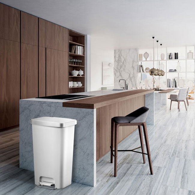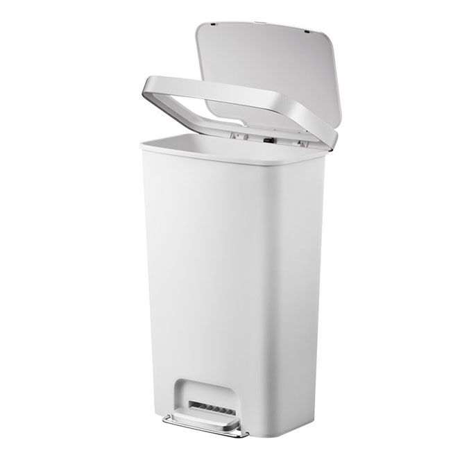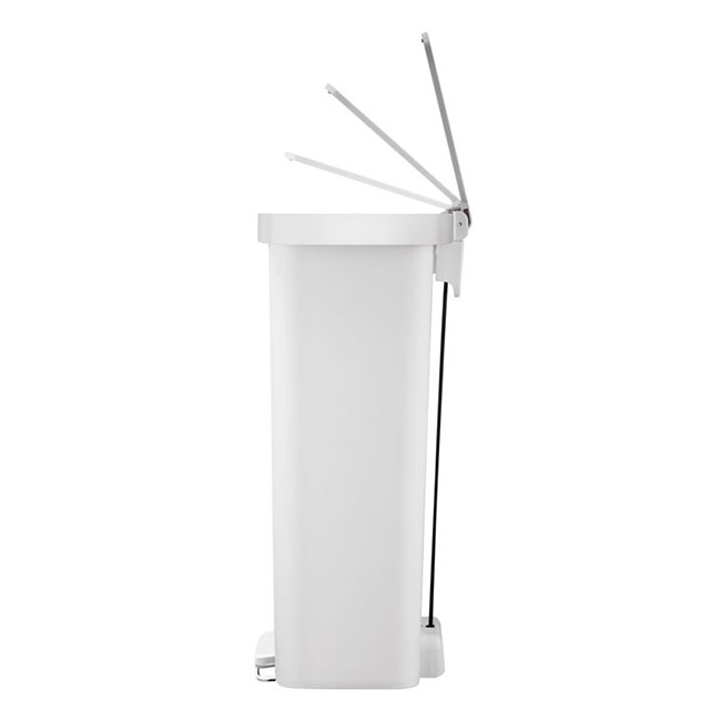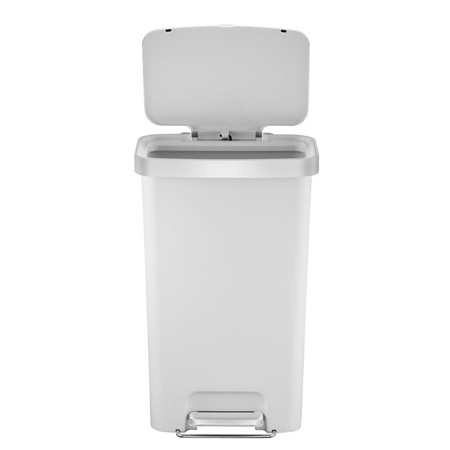 Функционален пластмасов кош с педал и плавно затварящ се капак. Кошът за отпадъци не съдържа вътрешна кофа, което го прави изключително просторен. Широкият фиксатор за торбата за отпадъци я държи на място и я скрива от погледа. Капакът може да се отвори напълно за лесно почистване на кофата или смяна на торбата за отпадъци. Кошът е снабден с вградени колелца отзад, което го прави лесен за преместване.