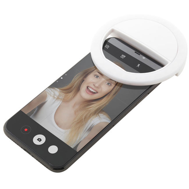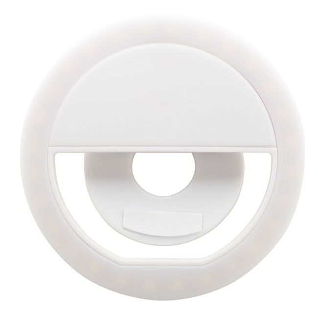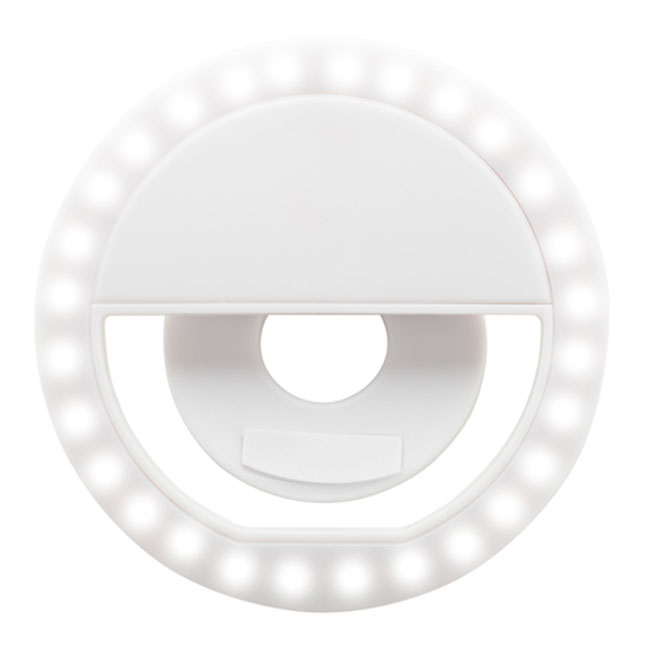 Пластмасова селфи ринг лампа с 28 LED светлини за мобилни телефони. С 3 регулируеми нива на яркост и вградена презареждаема батерия. Включва USB кабел за зареждане.