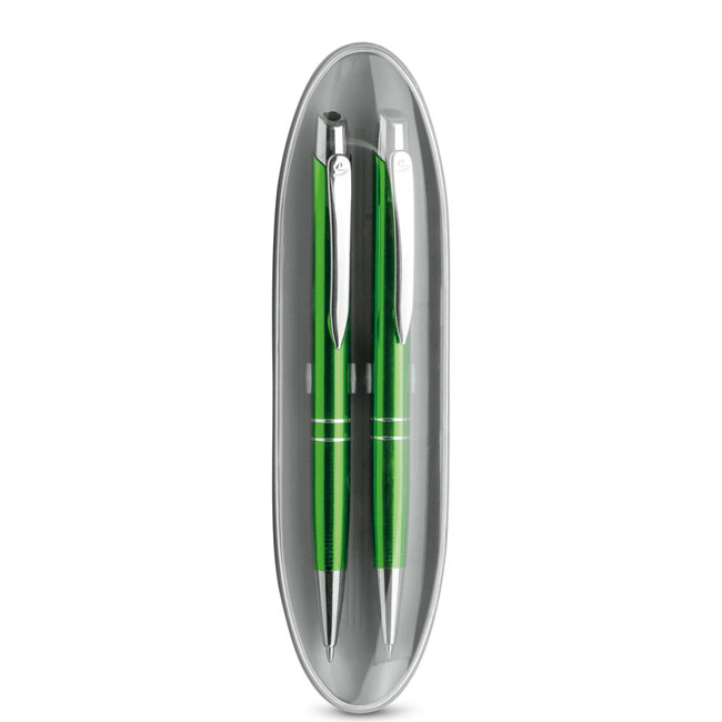 - Комплект метална химикалка и механичен молив, с цветно тяло и хромирани елементи, в пластмасова кутия.