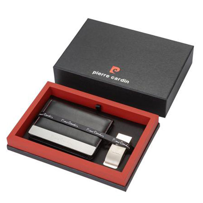 • Луксозен комплект, който съдържа калъф за документи и щипка за пари, съчетани със стилна кутия Pierre Cardin.
