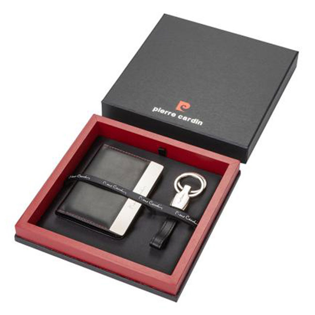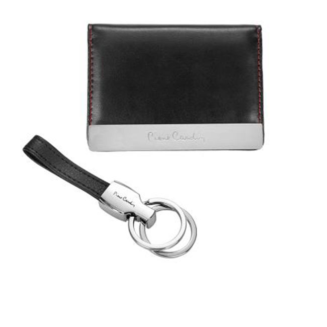- Луксозен комплект, който съдържа калъф за документи и ключодържател, съчетани със стилна кутия Pierre Cardin.