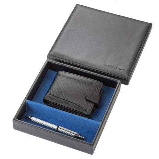 - Луксозен комплект, който включва портфейл от естествена кожа и елегантна химикалка в подaръчна кутия на SILVER FLAME.