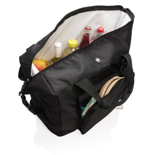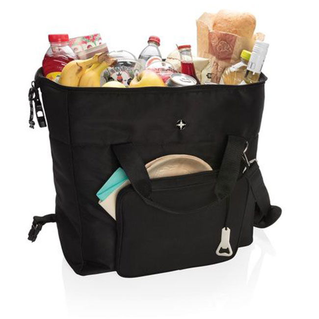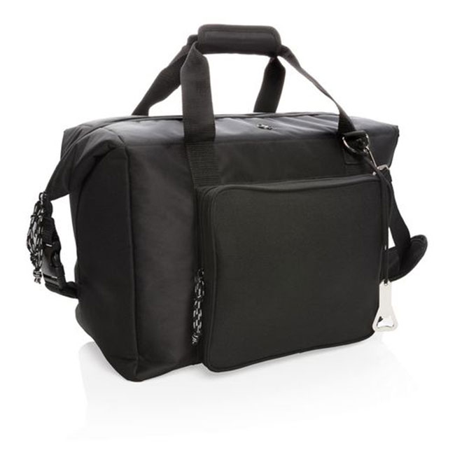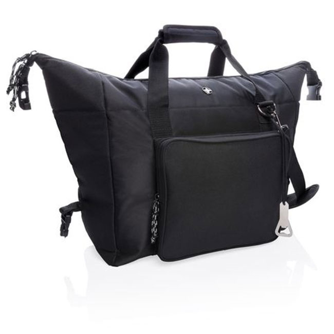 Луксозна полиестерна хладилна чанта с изключително голямо основно отделение с цип и преден джоб с цип. Може лесно да се трансформира в хладилна чанта със затваряне на страничните презрамки. Огромно място за съхранение от 40 л; побира до 10 x 1,5L бутилки или 52 кенчета. Двойно подсилени дръжки за носене. Подвижна регулируема презрамка. Включително отварачка за бира.