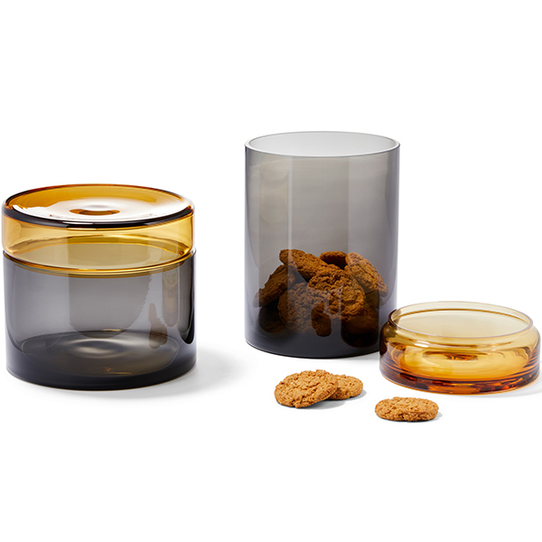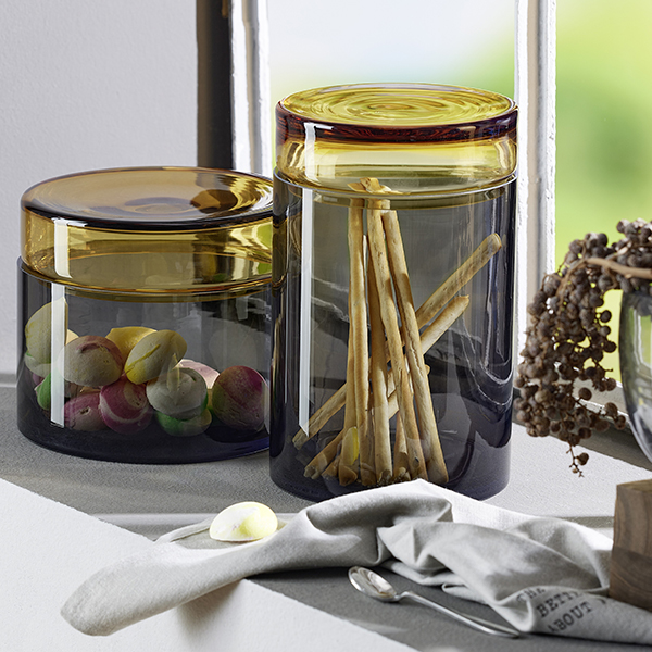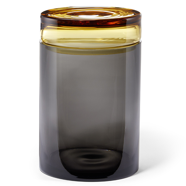 Страхотна цветова комбинация - блестящият кехлибарен капак е идеален в своята второстепенна функция, а именно като купа за ядки, бисквити и сладкиши, а голямото цилиндрично тяло от цветно опушено стъкло поема основната задача - като ваза или за съхранение на бисквити, макарони, бонбони, ядки или цветни близалки.