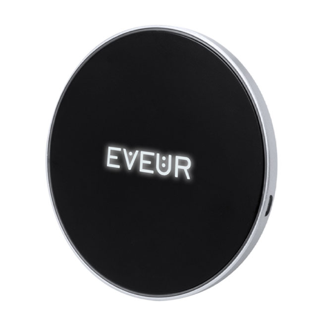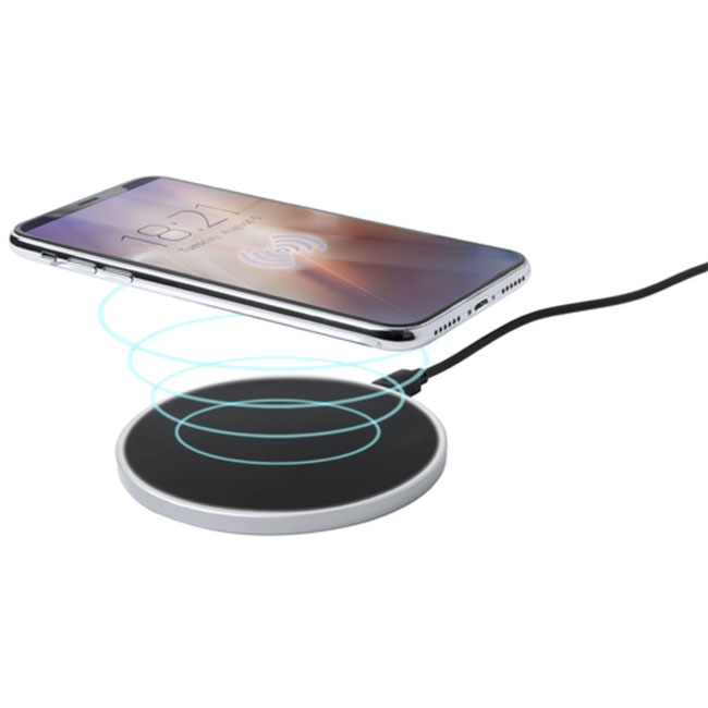 • Безжично зарядно (5W) с пластмасов корпус и LED светлина вътре в корпуса за светещо гравиране. Включва USB кабел за зареждане.