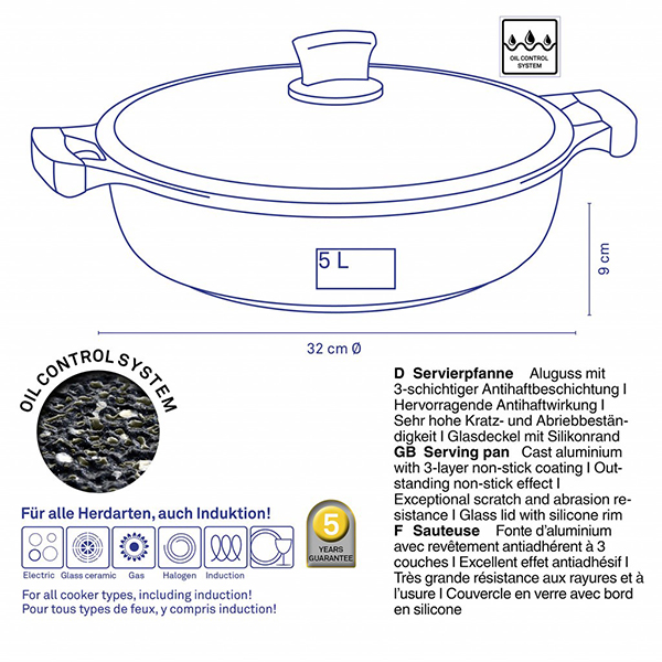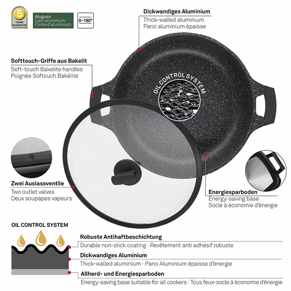 В зависимост от вашите желания и рецептата е възможно да използвате един и същ тиган за хрупкаво или меко пържене: запечено на висока температура, пърженото получава страхотно хрупкава и вкусна коричка и въпреки това лесно се отделя от незалепващата повърхност . Много хиляди микровдлъбнатини в структурата (система за контрол на мазнината) правят това възможно.