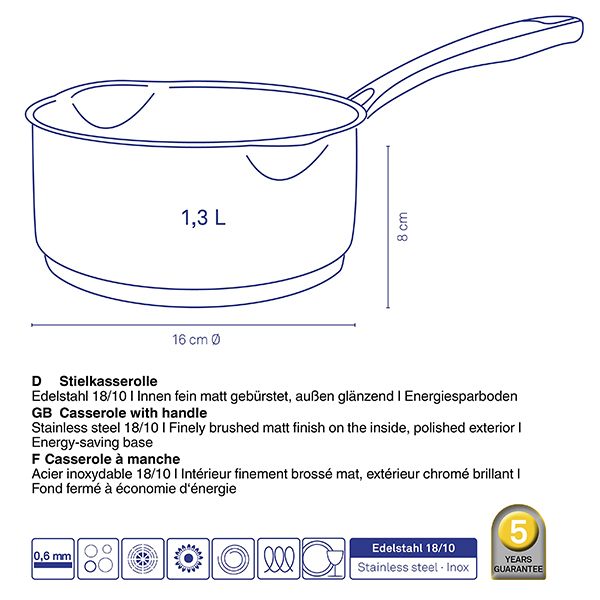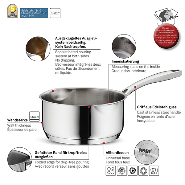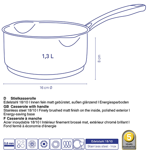 • Енергоспестяващото многослойно дъно е обработено с Impact-Bonding-Technologie. Това позволява перфектно сцепление, максимална устойчивост на големи температурни амплитуди и оптимално разпределение на топлината.