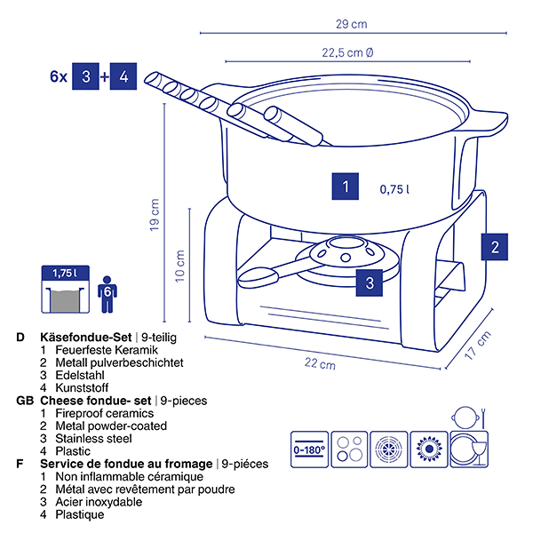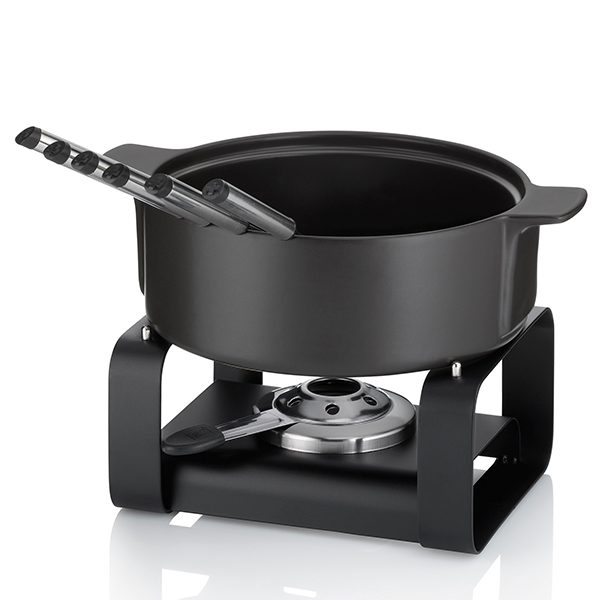 Комплектът за фондю от 9 части Roman съдържа всичко необходимо за една прекрасна и спокойна вечер с близки хора. Дори в обикновени вечери комплектът за фондю Roman Ви кани на уютна вечер в спокойна атмосфера. Благодарение на шестте включени вилици за фондю е много лесно да организирате приятно групово събитие, в което всеки може да участва.