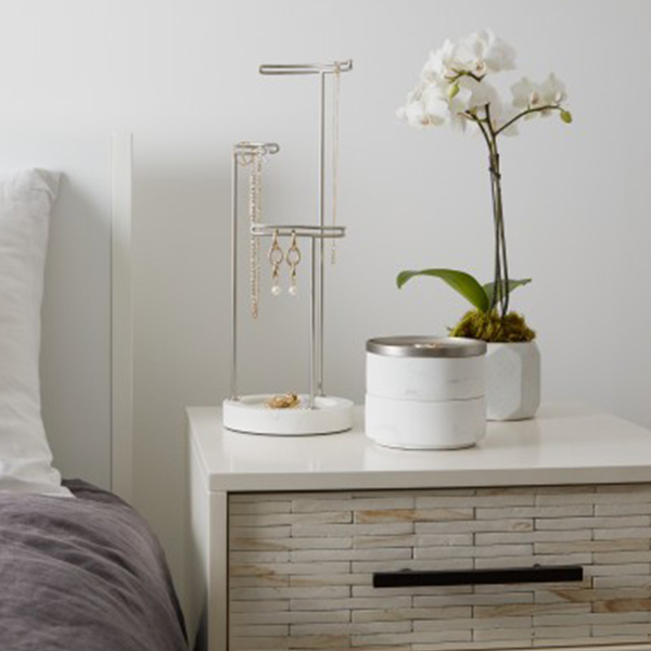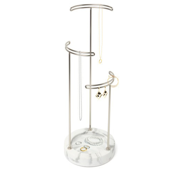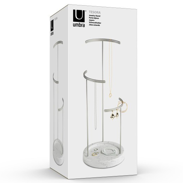 Tesora е проектиран с три метални стойки с различна височина, за да побере бижута с всякаква дължина.