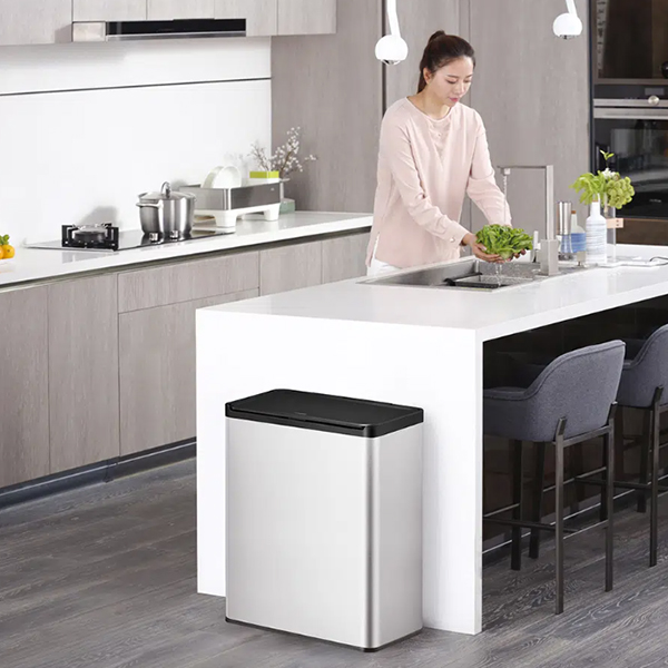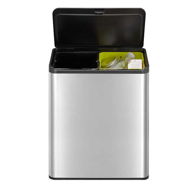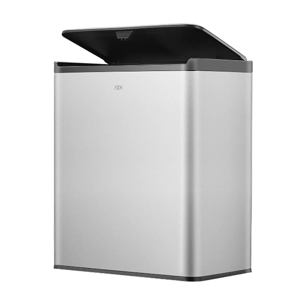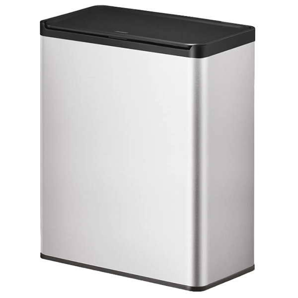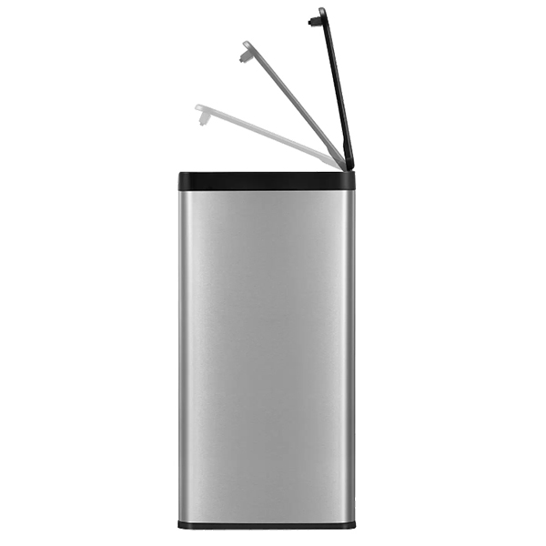 Правоъгълен кош за боклук от матирана неръждаема стомана с покритие, устойчиво на пръстови отпечатъци и пластмасов капак Touch Open, за да отворите коша с едно докосване.