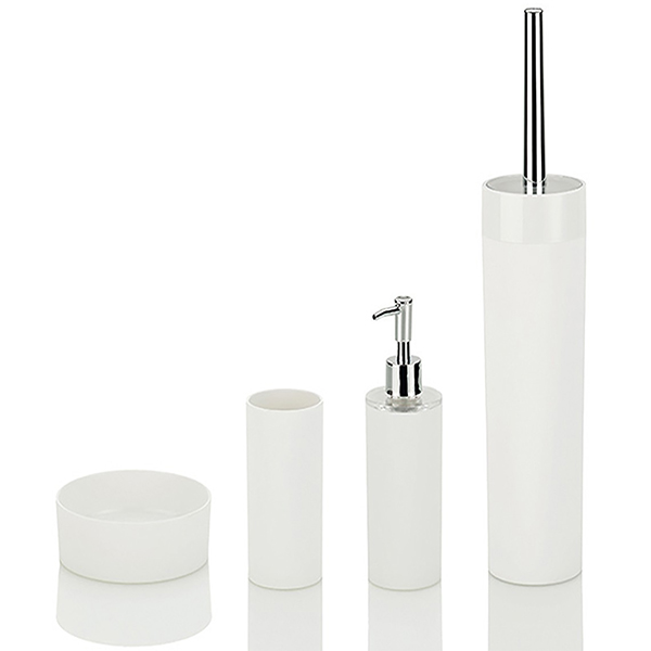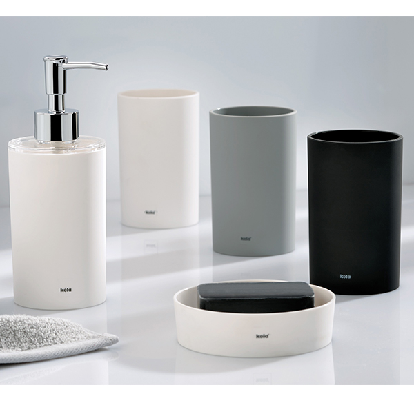 Пластмасовите аксесоари за баня с кадифена, леко грапава повърхност, се предлагат в семпли цветове.