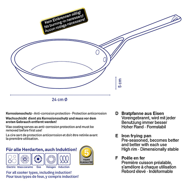 Не е нужно да сезонирате (омаслявате) тигана! Тиганът вече е предварително омаслен! Цветът на тигана идва от предварителната обработка. Тиганът не е подходящ за съдомиялна машина!