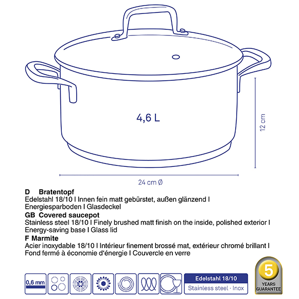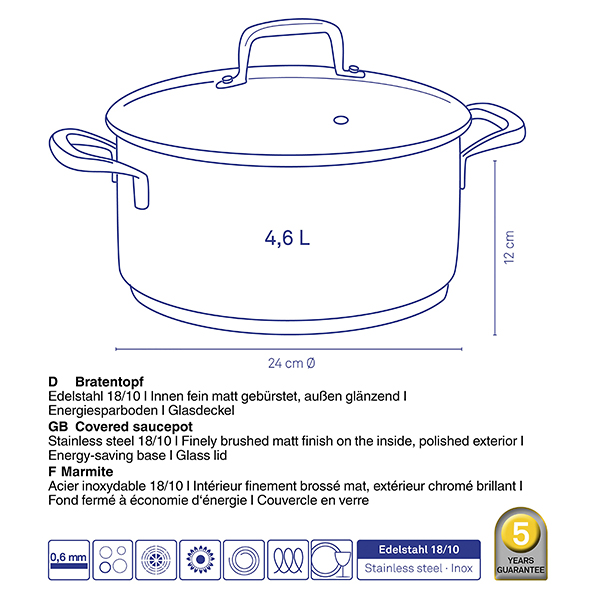 • Енергоспестяващото многослойно дъно е обработено с Impact-Bonding-Technologie. Това позволява перфектно сцепление, максимална устойчивост на големи температурни амплитуди и оптимално разпределение на топлината.