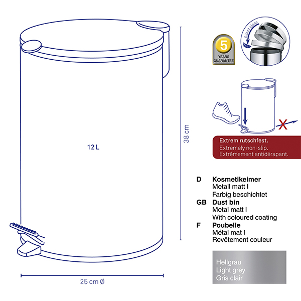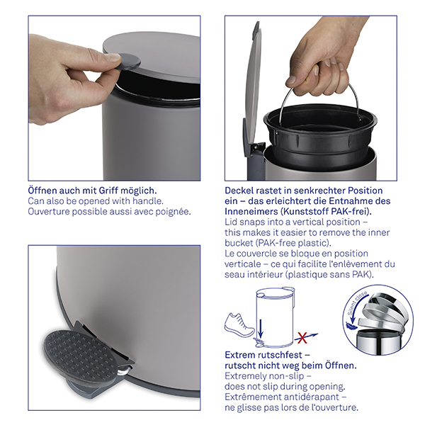 Кошът Mats с капацитет 12 литра е универсален за Вашата баня и кухня. Благодарение на интегрираната система за безшумно затваряне в капака, Mats затваря капака си много тихо и бавно. И ако искате да отворите капака без функцията на педала, кошът има дръжка на капака, която можете да използвате, за да го отворите лесно с ръка. Тъй като капакът щраква на място във вертикално положение, можете лесно да извадите вътрешната кофа, без капакът постоянно да се затваря отново. Благодарение на дръжката на вътрешната кофа можете също така да гарантирате, че кофата се изпразва много хигиенично, без да се налага да влизате в контакт със съдържанието. Освен това капакът е много плосък, което спестява много място. Имате повече пространство за съдържанието и има достатъчно пространство отгоре, за да поставите всякакви декорации или мебели над него. Но кошът Mats не се отличава само с капака. Освен това, благодарение на нехлъзгащата си основа, той е много убедителен по отношение на стабилността в банята. В допълнение, кошчето с педал има дръжка за носене под пантата, което го прави много лесно за носене, без да се налага да го хващате неудобно
