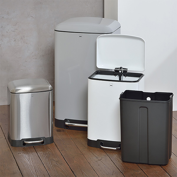 Кошовете с педал от серия Davino са с вместимост 6, 12 или 30 литра и са изработени от стомана, прахово боядисана за цветните модели. Те впечатляват с изчистения си дизайн и функционалност. Кошовете с педал са оборудвани с технологията Silent Close, т.е. капакът не пада просто при затваряне, а се затваря приятно тихо. Ако бутнете капака леко назад, когато е отворен, той остава в това положение и можете да извадите вътрешната кофа, за да я изпразните. След това можете да натиснете капака обратно надолу и той отново се затваря тихо.