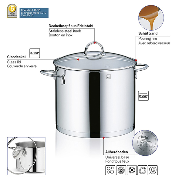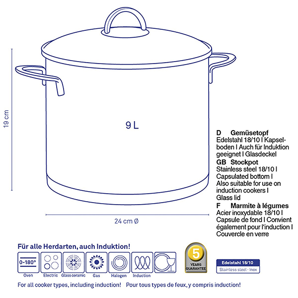Тенджерите и тиганите са подходящи за газови, стъклокерамични, електрически и индукционни котлони и са устойчиви на фурна до 180°C.