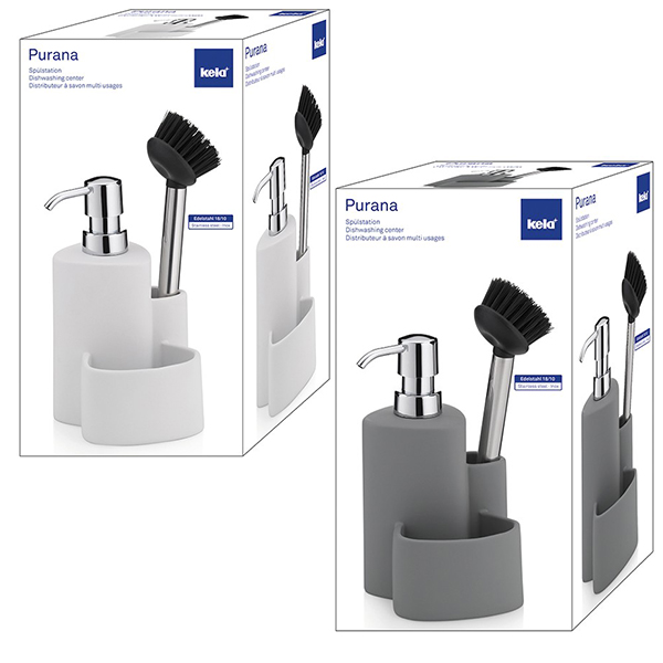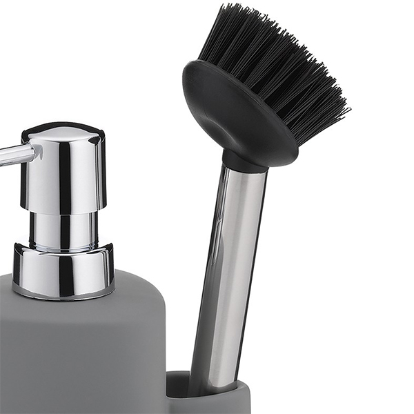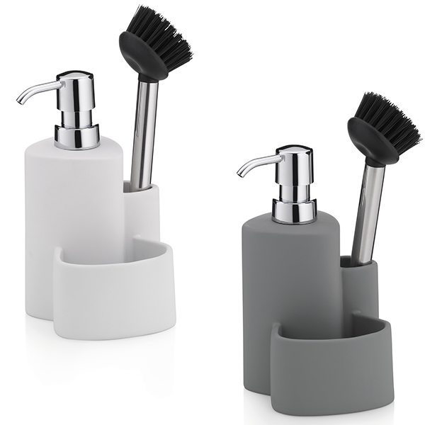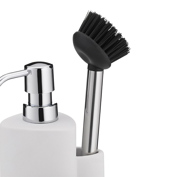 Практичен комплект за миене на съдове, състоящ се от дозатор за сапун или препарат за съдове, отделение за четка за миене на съдове с включена четка, и друго отделение за гъба или тел за съдове. Това позволява най-важните аксесоари, които са необходими на мивката и често стоят един до друг, да се поставят спретнато и централно. Корпусът на дозатора е изработен от керамика.