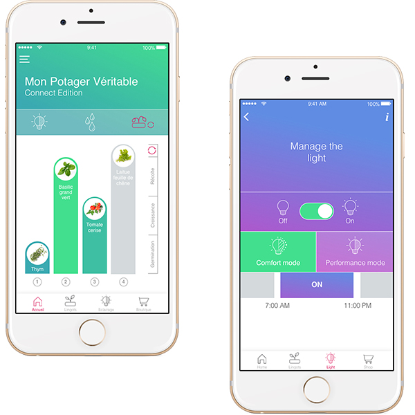 Домашна градина CONNECT Véritable® е интелигентна и се свързва с вашето мобилно устройство, чрез Bluetooth. Специално безплатно приложение ( за iOS и Android) ви позволява да следите развитието на вашите растения, да изберете режима на осветление и да бъдете предупредени, когато резервоарът за вода е празен.