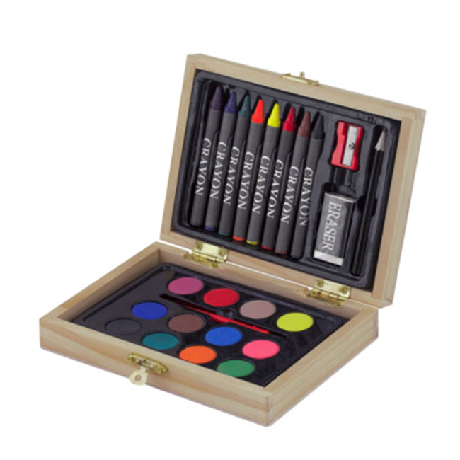 - Кутия с 12 цвята водни бои, четка за рисуване, 8 цвята пастели, гума, острилка и молив.