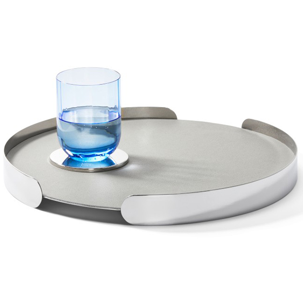 Един поднос, две повърхности, множество функции, всичко добре обмислено! Започвайки с ограничителя, който не позволява на нещата, които трябва да бъдат пренесени, просто да паднат в кратка фаза на невнимание. Прекъснат от две много практични вдлъбнати дръжки. Допълнен с подложка от имитация на кожа, която не позволява изплъзване по време на транспортиране и може да се пере многократно. Увенчан от гръб със силен гланц, който удвоява вече високия фактор на блясък на шампанско, благодарение на отражението. Това е подносът FROID!
