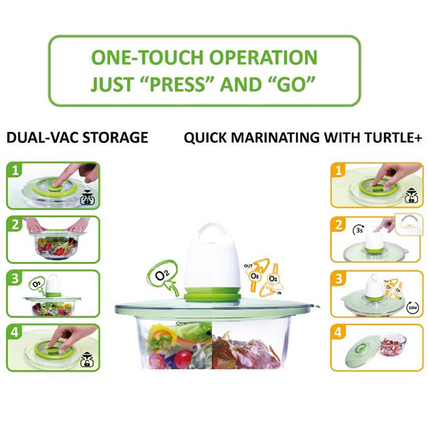Вакуум помпата има два режима на работа - вакуумиране и бързо мариноване. При втория режим тя изпомпва въздуха от купата, а след време вкарва въздух в нея. По този начин се постига много по-бързо мариноване на продуктите. За малката купа от комплекта времето за мариноваме със системата FOSA е 25 мин, а за голямата - 30 мин. За всяко домакинство, което иска лесно и устойчиво решение за запазване храна за по-дълго.