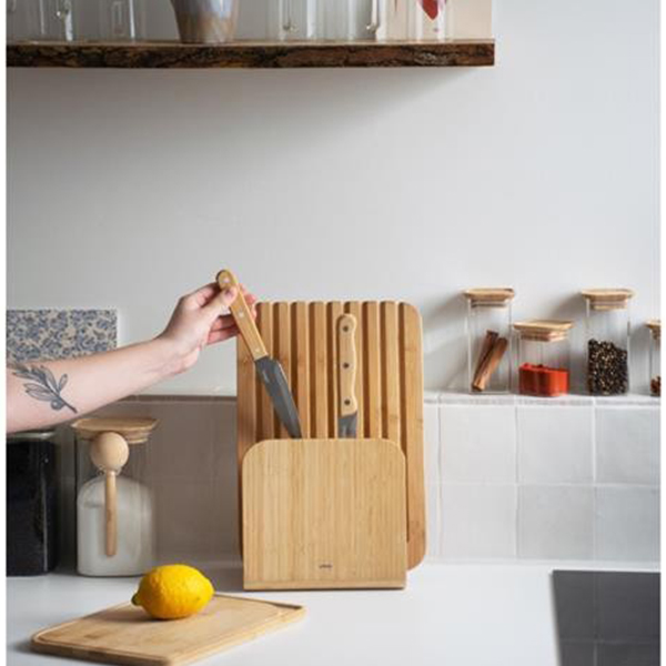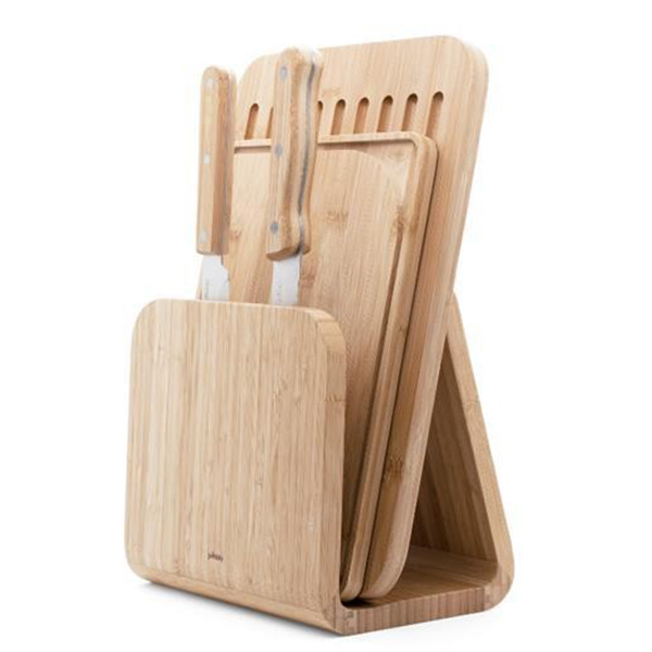 Комплектът за готвене е полезен за всички Ваши ежедневни приготовления: той се състои от бамбукова дъска за рязане, бамбукова дъска за хляб, нож на майстора, нож за хляб и практична поставка, в която да съхрянявате всичко това.