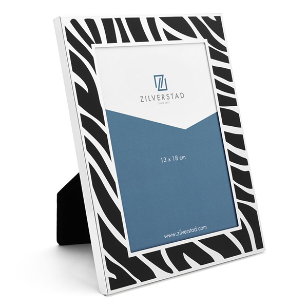 Рамка за снимки със сребърно покритие и принт на зебра. Предлага се в размери 10 х 15 см и 13 х 18 см. Може да се използва както окачена, така и стояща.