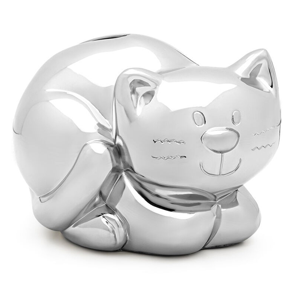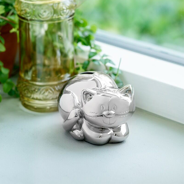 Касичка във формата на котка. Касичката е със сребърно покритие, лакирана е и не изисква полиране. Касичката може да бъде гравирана, което я прави идеална за личен подарък.