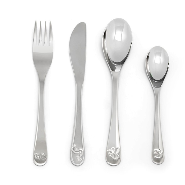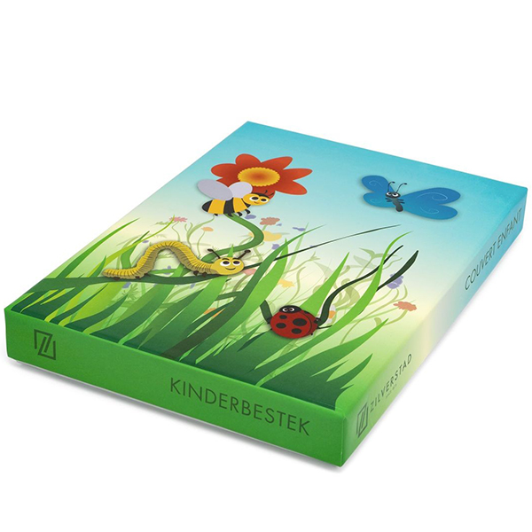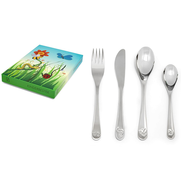 Храненето е още по-забавно с този комплект детски прибори Zilverstad с приятели от природата. Пчелата, калинката, гъсеницата и пеперудата са за празник на масата. Комплектът прибори за хранене от 4 части е изработен от неръждаема стомана 18/10 и може да се мие в съдомиялна машина. Приборите са подходящи за гравиране. Страхотен подарък за бебе или подарък за рожден ден. Комплектът прибори се предлага в подходяща подаръчна кутия.