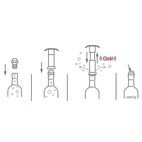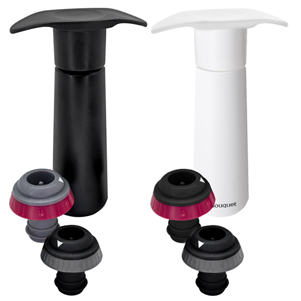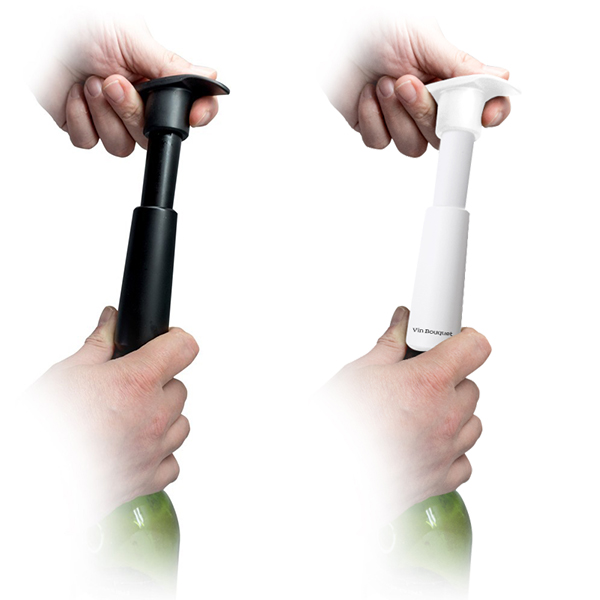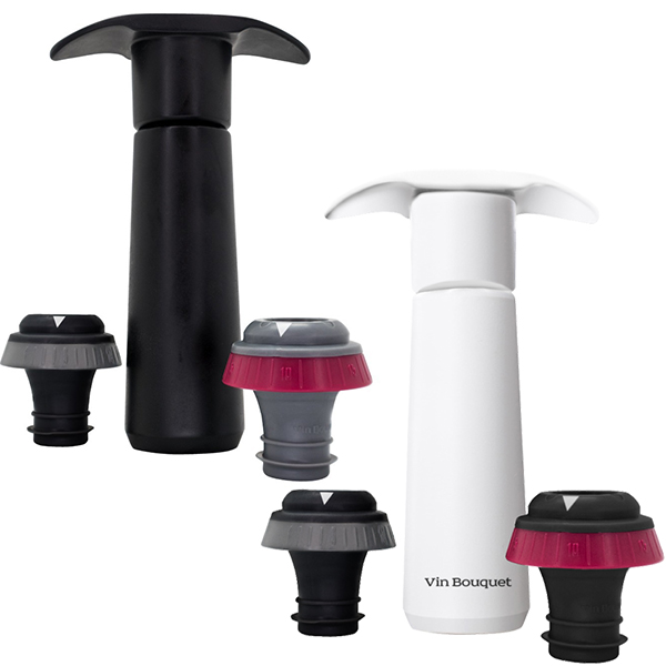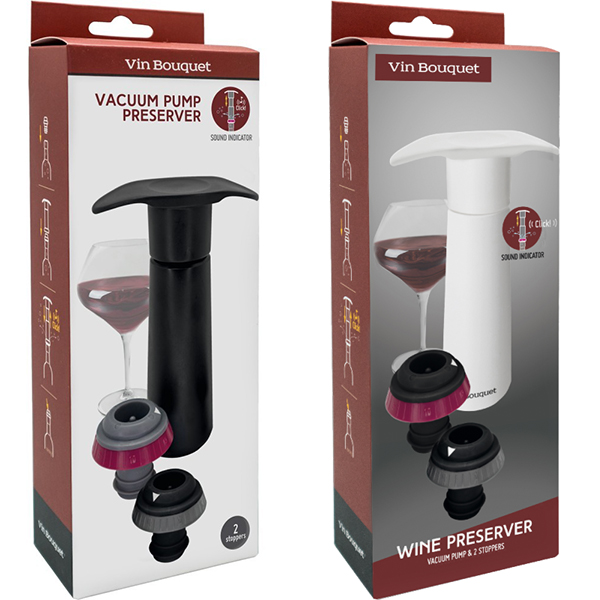 Ръчна вакуумна помпа със звуков индикатор. Благодарение на вакуумната помпа в бутилката се създава вакуум, който запазва виното след отваряне, благоприятствайки запазването на виното за по-дълго време. Изтеглянето на въздуха от бутилката предотвратява процеса на окисление на виното, който е отговорен за влошаването на виното. Комплектът включва 2 тапи. В новата вакуум помпа Vin Bouquet е вградена система Click, която предупреждава, когато вакуумът на бутилката е направен правилно.