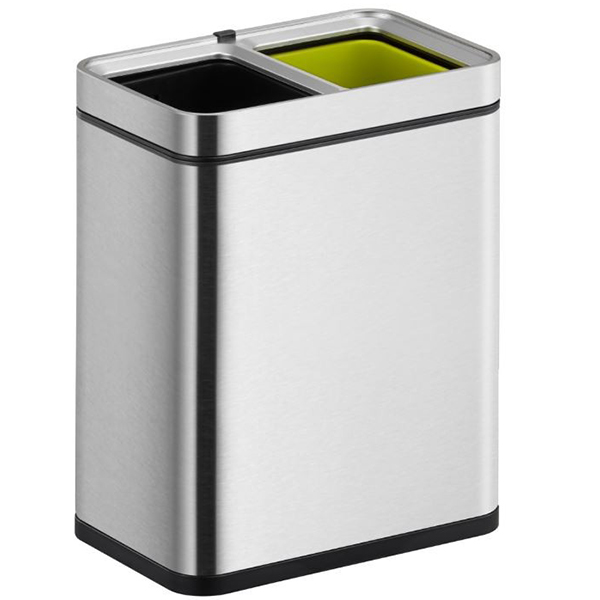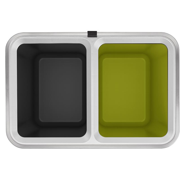 Отворен компактен кош за отпадъци от матирана неръждаема стомана. Оборудван с две пластмасови вътрешни кофи (2x 10 литра) и покритие, устойчиво на пръстови отпечатъци. Торбите за боклук се сменят лесно. Стилен и спестяващ място.