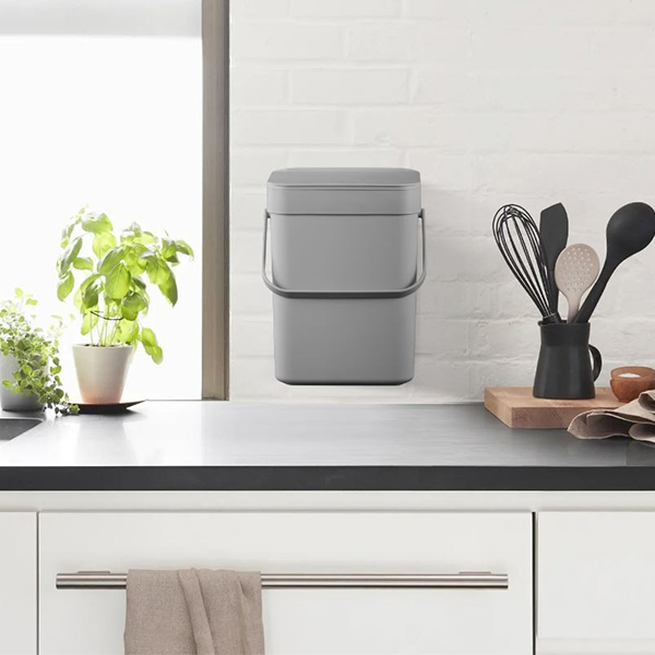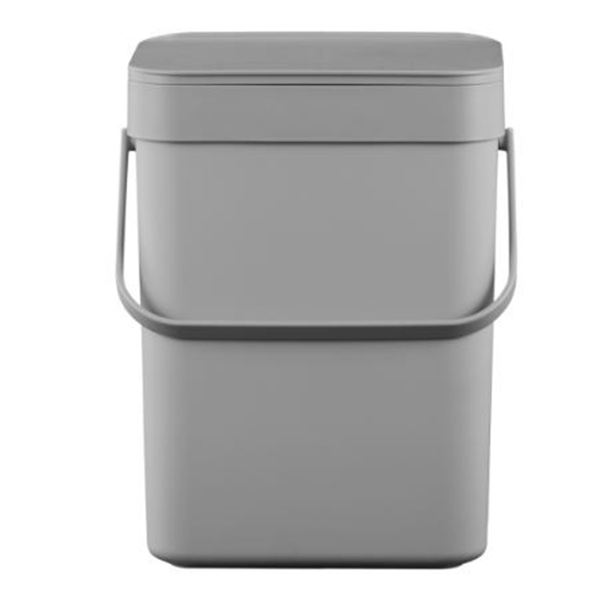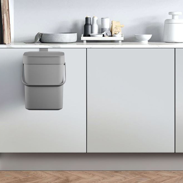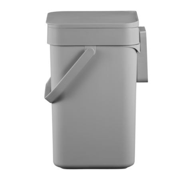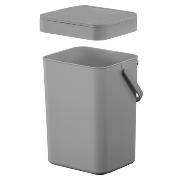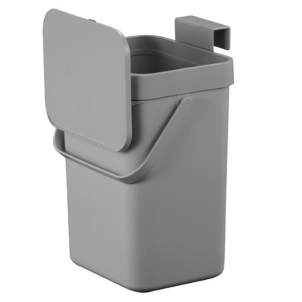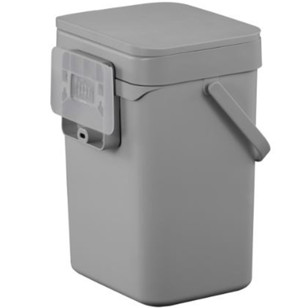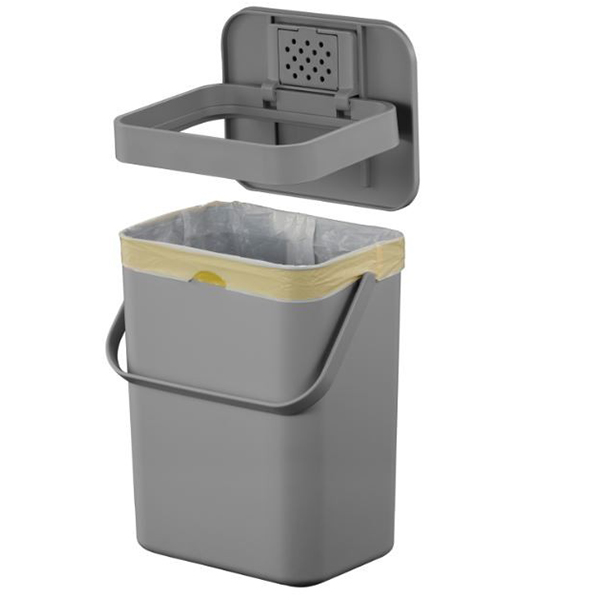 Компактен пластмасов кош за хранителни отпадъци. Снабден с удобна дръжка за лесно преместване. Двата начина на отваряне на капака повишават ефективността при използване. Лесен за окачване на вратата на кухненския шкаф, може също да се закачи на стена или да се постави на плота. Кошът има подвижна рамка, за да държи торбата с отпадъци на място и е лесен за почистване.