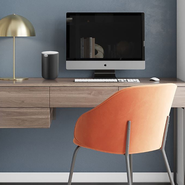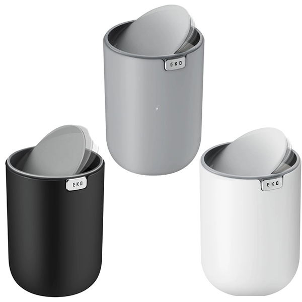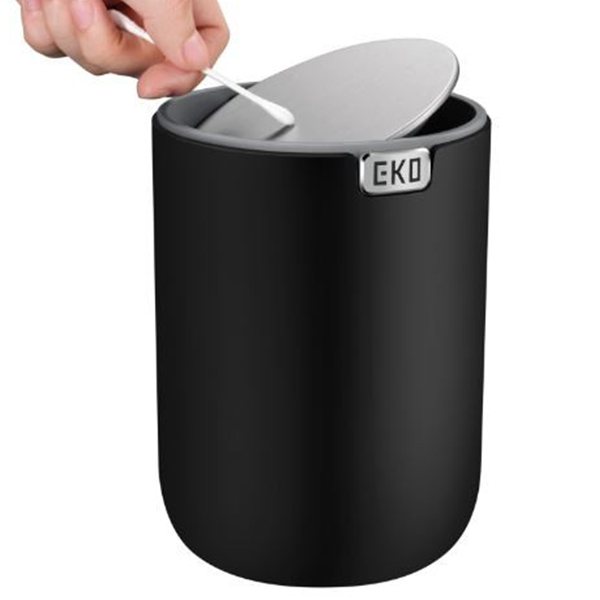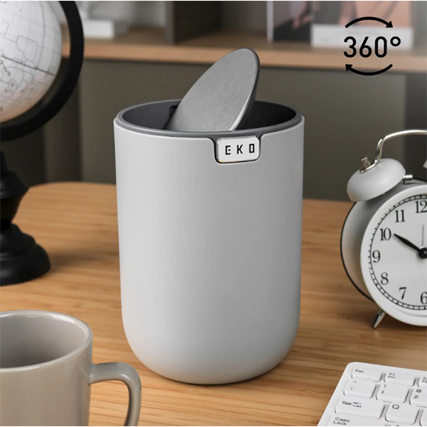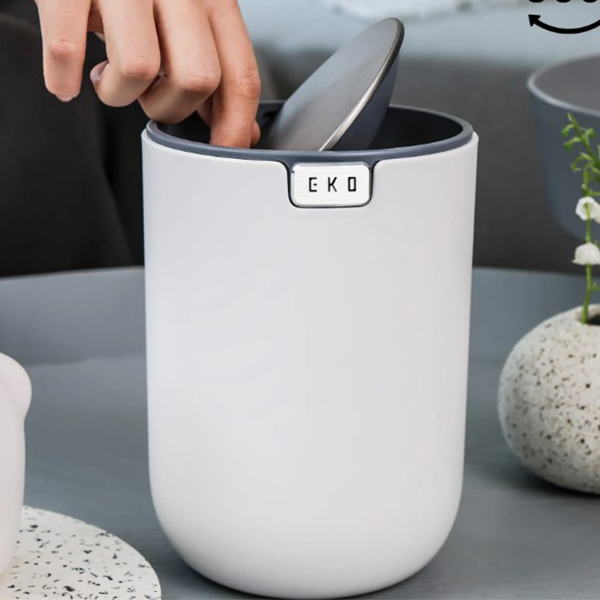 Настолен кош за отпадъци, изработен от пластмаса. Удобният матов въртящ се капак от неръждаема стомана се затваря автоматично след употреба.