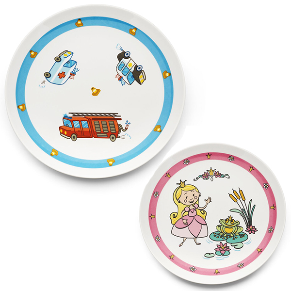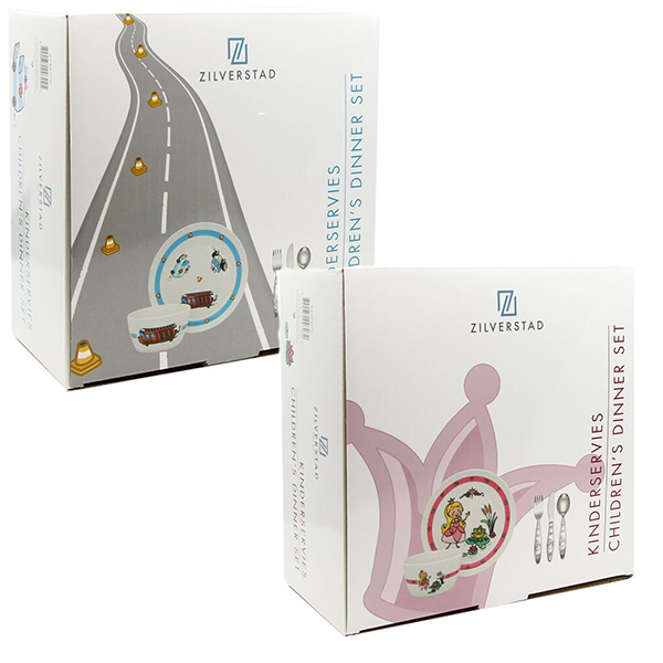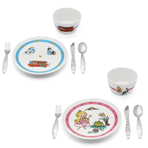 Сервиз за хранене за деца, състоящ се от порцеланова чиния и купа и комплект прибори от неръждаема стомана 18/10. С изображения на весели принцеси, които добавят още повече забавление към първите хапки. Комплектът се предлага в здрава цветна подаръчна опаковка.