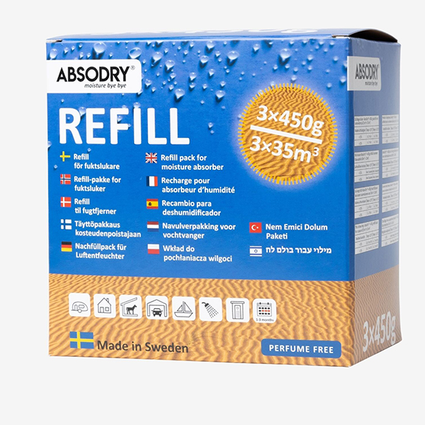 Absodry 3 бр резервни пълнители/торбички са БЕЗ АРОМАТ. Тази опаковка съдържа 3 торбички х 450 гр. , които са подходящи за следните модели влагоабсорбатори: CLASSIC, MAXI, MINI и CAMPER.