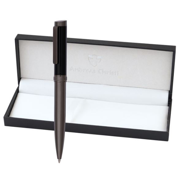 Стилна метална химикалка с изчистен класически дизайн от колекцията пишещи инструменти Andreas Christi. Фините декоративни гравюри по нейния металик корпус съчетани с висококачествен черен лак ѝ придават изискан и модерен дизайн.