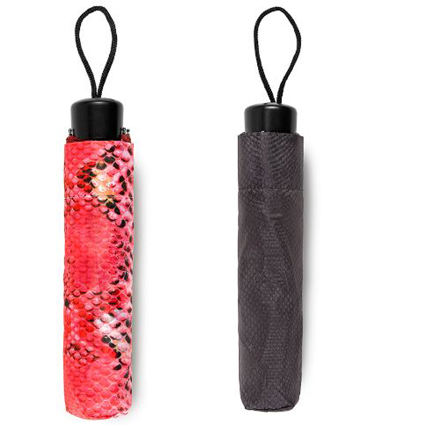 Стилен и удобен автоматичен сгъваем чадър с гущерска шарка. Има три степени на отваряне и затваряне, което допринася за неговата компактност, 8 панела. Има удобна права дръжка с каишка за китка. Доставя се в калъф и картонена кутия със същата шарка.