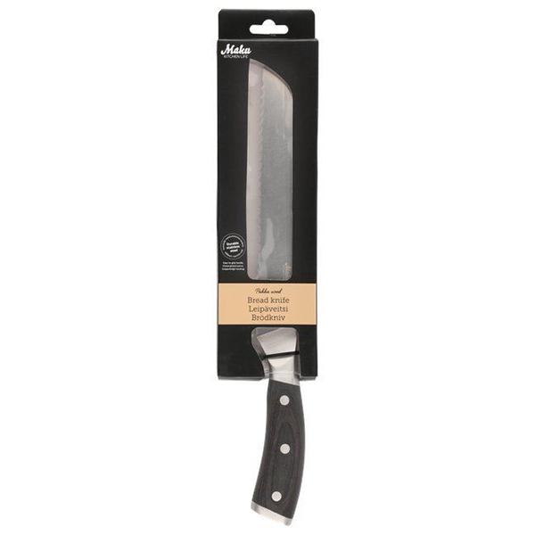 Висококачествен и стилен нож за хляб, изработен от висококачествена немска молибден - ванадиева стомана с твърдост HRC 56 +/- 2. Дръжката на ножа е изработена от красиво и много издръжливо дърво пака. Не е подходящ за съдомиялна машина.