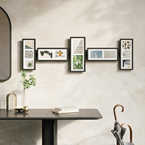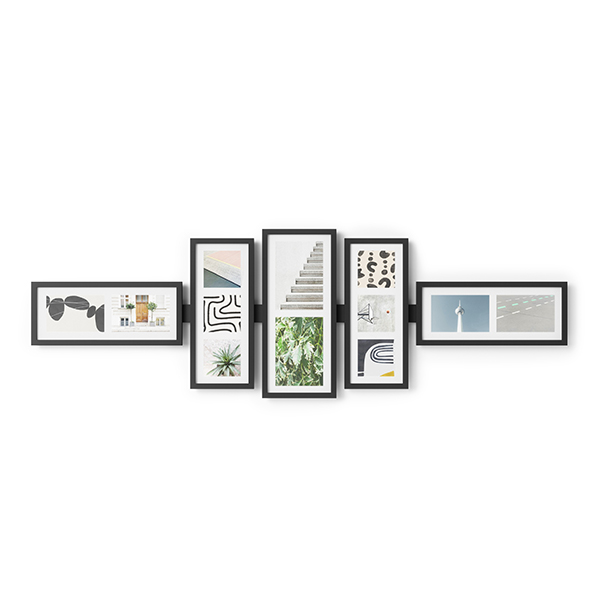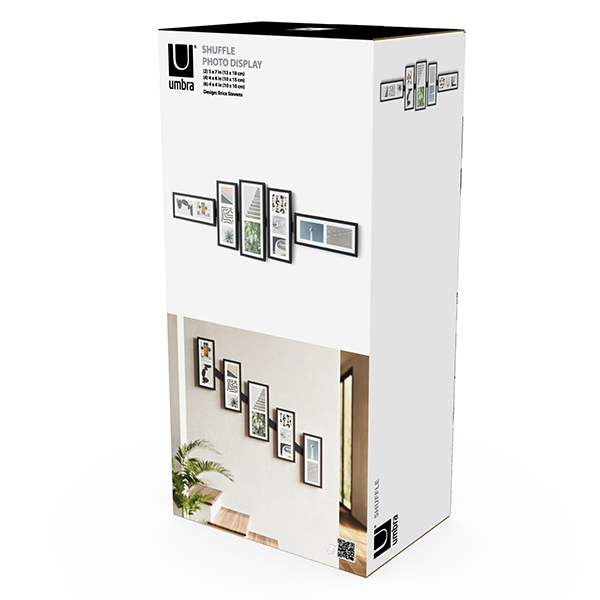 Създайте и персонализирайте своя собствена галерията с SHUFFLE. Комплектът включва 5 бр рамки за снимки, които се монтират върху релса. Рамките могат да бъдат ориентирани вертикално, хоризонтално или диагонално. В рамките за снимки можете да поставите общо 12 бр снимки:  6 бр с размер 10х10 см + 4 бр с размер 10х15 см + 2 бр с размер 13х18см. Лесен за монтаж, чрез само три винта. Монтажните елементи са включени в комплекта.