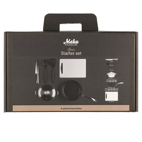 Отличен стартов комплект за Вашия първи дом или за подарък на младо семейство. Комплектът включва всичко първоначално необходимо за всяка кухня – тенджера Basic със стъклен капак от стомана 3 л, тиган от алуминий с незалепващо покритие, лъжица за готвене и сервиране Basic, шпатула Basic, пластмасова дъска за рязане Basic 35 x 26 см, стоманен нож на майстора.