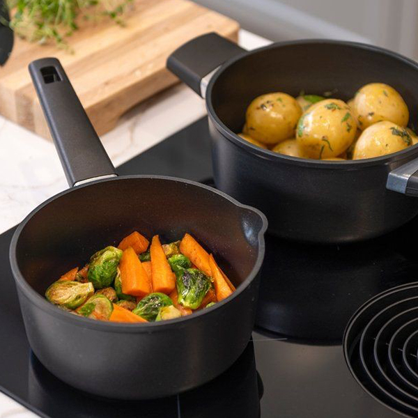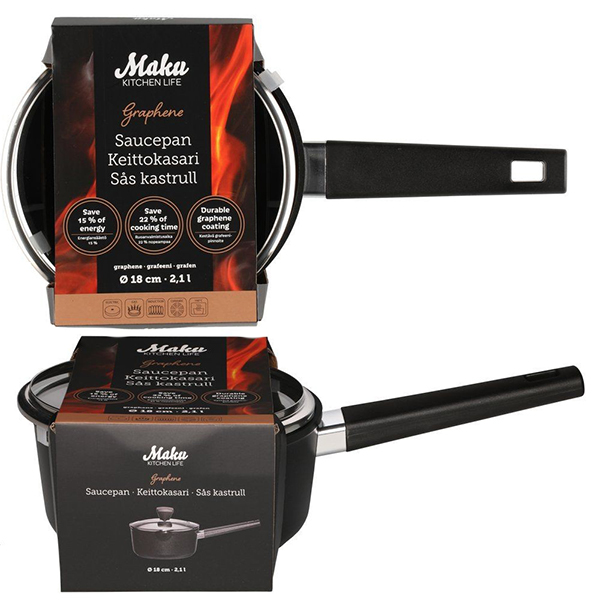 Енергийно ефективният съд за сос Maku Graphene е с алуминиево тяло, има подсилено с графен външно покритие, което осигурява отлична издръжливост и бързо и равномерно предаване на топлина. Графеновото покритие е много издръжливо и по-устойчиво на износване от повечето други покрития. Този съд прави готвенето с 22% по-бързо и спестява до 15% енергия. Незалепващото вътрешно покритие прави готвенето по-лесно и почистването безпроблемно. Черната бакелитна дръжка осигурява добър захват и не се загрява. Съдът за сос е подходящ за всички видове котлони и може да се мие в съдомиялна машина.