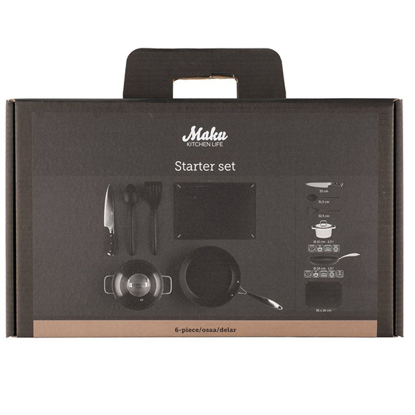 Отличен стартов комплект за Вашия първи дом или за подарък на младо семейство. Комплектът включва всичко първоначално необходимо за всяка кухня – тенджера със стъклен капак от стомана 3 л, тиган от алуминий с незалепващо покритие, лъжица за готвене и сервиране , шпатула , пластмасова дъска за рязане Basic 36 x 26 см, стоманен нож на майстора Pakka.
