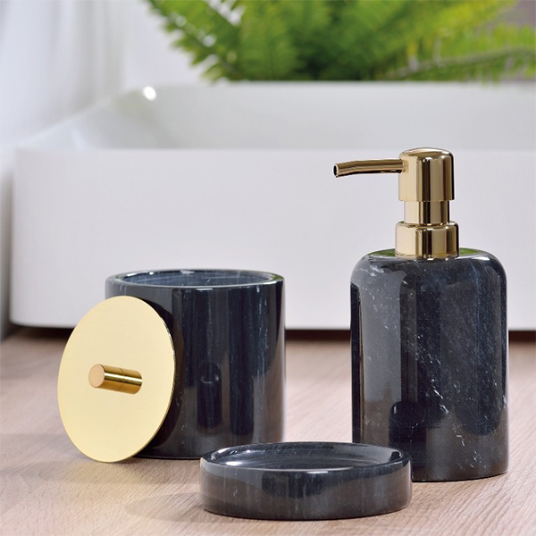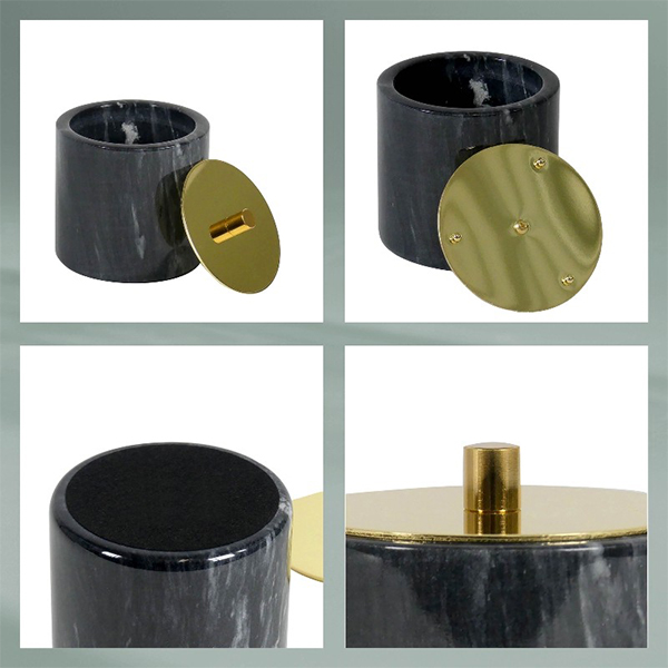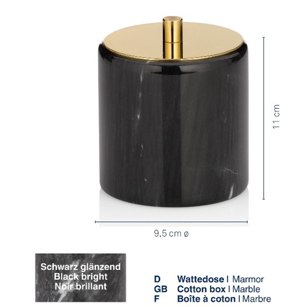 Защо тези аксесоари за баня са черни? Защото за Kela е важно да покрие широка гама от стилове, възможности и дизайни в областта на аксесоарите за баня, така че да има по нещо за всеки вкус. Кутията за козметични тампони или аксесоари от серията Liron е изработена от мрамор и има практичен златист капак с малка дръжка.