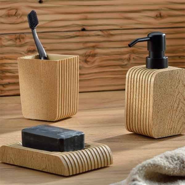 Търсите красиви, здрави аксесоари за баня с естествен вид? Внесете нотка природа във Вашата баня или тоалетна и я оборудвайте със серията Kaiu. Тази сапунерка е изработена от полирезин и впечатлява с красивата си дървена визия. В съответствие със сапунерката ще намерите също четка за тоалетна, дозатор за сапун и поставка за четки за зъби.